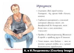 А.П.: Я практически во всех этих городах бывал и неплохо знаю людей оттуда, которые в некотором смысле являются носителями кодов этих городов. И еще из всех поездок привозишь не только фотографии, а какие-то байки, истории, местные словечки. Все это обсуждаем с Ириной, и так рождаются образы. Вот, например, Иркутск. Там университет, наверное, множество образованных людей, это один из самых интеллигентных городов Сибири. Но бросается в глаза и совсем другое: так называемые партаки. Их запредельно много. И это не какие-то красивые рокерские татуировки, а синие солнышки, имена, кольца и так далее. В основном их делают себе люди из Иркутской области: Ангарска, Братска, Усть-Илимска, которые где-то там отсидели, а потом приехали в областной центр жить. И нам захотелось в наших картинках отыграть не образ университетского интеллигента, а вот этих людей с партаками. Изначально у меня родился образ прям такого лютого зэка. Потом я понял, что это слишком грубо, Иркутск – это все-таки не зэковский город. И мы стали смягчать: человек отсидевший, он знает все зоновские понятия, но он не кичится этим, то есть это все-таки не маргинал. Отчасти прототипом можно считать легендарного местного музыканта – я первый раз его увидел году в 2003-м, наверное. Он стоял около местного ЦУМа с электрогитарой, подключился к какому-то простенькому усилителю и пел песни, которых я не знал. И он был весь в наколках, видно, что сидел. А песни-то прикольные! С налетом блатняка, но в принципе, это рок-музыка. А потом мне местные ребята и говорят: так это Серега Хакимов, его все знают. Я его потом в фейсбуке нашел, мы с ним задружились. Вот, пожалуй, очень яркий пример.