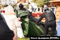 Между тем к моменту, когда протестующие после шествия вернулись на площадь, несколько человек начали расставлять три палатки.