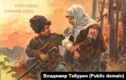– Серия "Пословицы в лицах", нарисованная для фирмы "Зингер", на выставке не представлена. Однако открытки из этой серии хранятся в фондах Музейного комплекса им. И. Я. Словцова. Они появились у нас еще до "Детского МИРа", – уточняет Лев Боярский. – На выставке представлены военные открытки Владимира Табурина 1914–1916 годов: "Ни с небом, ни с ветром не дружись...", "В тесноте, да не в обиде", а также уже упомянутая серия "Дети-политики" 1917 года.